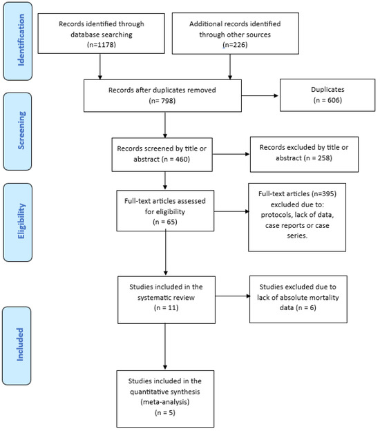 A total of 1404 studies were initially identified after electronic database and manual search. After the removal of 606 duplicates, we screened the titles and abstracts of 460 studies. The screening of the full text of such articles led to the exclusion of a further 395 studies, resulting in 65 articles assessed for eligibility. Finally, 11 studies [14,15,16,17,18,19,20,21,22,23,24], including 8 RCTs and 3 observational studies, were included in the systematic review and 5 of them (3 observational and 2 RCTs) in the meta-analysis. The process of study selection is represented in the PRISMA flow diagram (Figure 1).