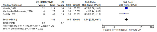 Only 5 trials (three in the CCP + remdesivir group and two in the CCP + steroids group) analyzed separately the mortality rate in both treatment and control arms and permitted to perform a pooled quantitative analysis [14,15,16,22,24]. Regarding the three studies [14,15,16] evaluating CCP alone or combined with remdesivir, the forest plot of comparison showed that the association CCP + remdesivir significantly reduced the mortality risk compared to CCP alone (RR 0.74; 95% CI 0.56–0.97; I2 0%, p = 0.03) (Figure 2). Regarding the two studies [22,24] included in the meta-analysis on CCP combined with steroids, no significant differences were found between CCP + steroids recipients and CCP-alone recipients (RR 0.72; 95% CI 0.34–1.51; I2 0%, p = 0.38) (Figure 3).