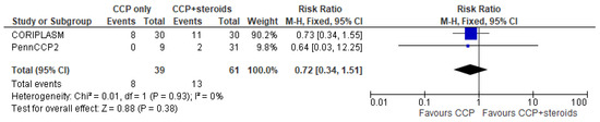Regarding the CCP + steroid group, five RCTs [18,21,22,23,24] observed a favorable outcome (i.e., mortality or clinical status) in patients receiving only CCP versus combined (CCP + steroids) therapy, while the others [19,20] found no interaction. Unfortunately, it was not possible to retrieve patients’ demographic and clinical information as these types of data were not available from subgroup analyses of single studies.