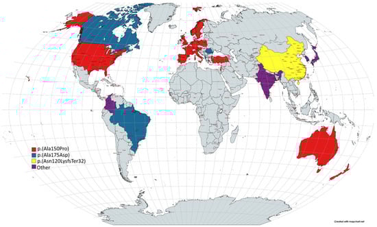 HFI has an estimated prevalence of 1 in 10,000 [8], although other studies suggest around 1 in 20,000 [4,7,9]. As a rare disease, its prevalence is less than 5 per 10,000 people, as defined by the European Parliament and the Council of the European Union [10]. The ALDOB gene is mapped to chromosome 9q22.3 and exhibits over 40 documented causative mutations [11]. The p.(Ala150Pro) and p.(Ala175Asp) variants are globally distributed, with distinct patterns in Europe (Figure 1) [8].