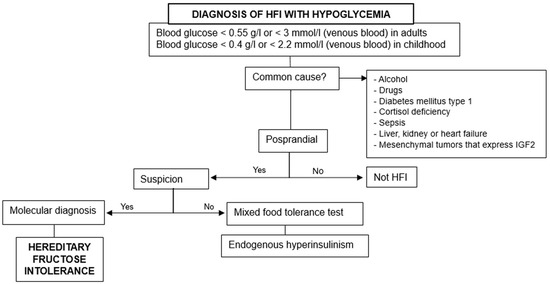 Diagnosis of hereditary fructose intolerance (HFI) with hypoglycemia (simplified diagram) [18].