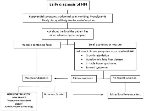 Upon identifying a mutation in the aldolase B gene, with the predominant global variants being p.(Ala150Pro) and p.(Ala175Asp), we will confirm the diagnosis of HFI. If no mutations are detected in the aldolase B gene, a mixed food tolerance test will be conducted to explore alternative pathologies. In situations where it is challenging to specify the implicated food or the fructose intake is not substantial, we will inquire about potential complications associated with HFI. If the patient has experienced growth retardation, non-alcoholic fatty liver disease, irritable bowel syndrome, hepatocellular necrosis, and/or Fanconi syndrome, suspicion of HFI will be heightened, prompting a molecular diagnosis. If clinical suspicion is not significant, a mixed food tolerance test will be employed to investigate other potential causes [5,8,37].