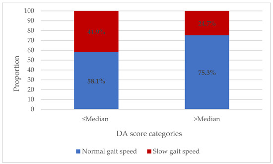 Distribution of gait speed according to median DA score.