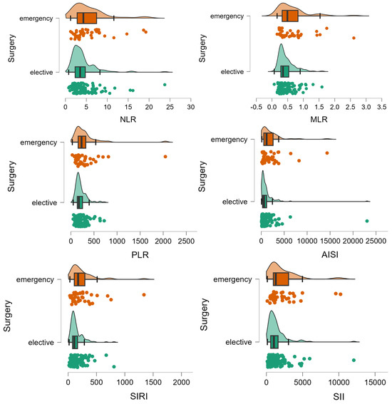 Distribution of inflammation ratios on patients with (elective) and without elective surgery (emergency). The circles represent the raw data, the box showed the median (middle line), first and third quartiles (box), respectively minimum and maximum values (whiskers).