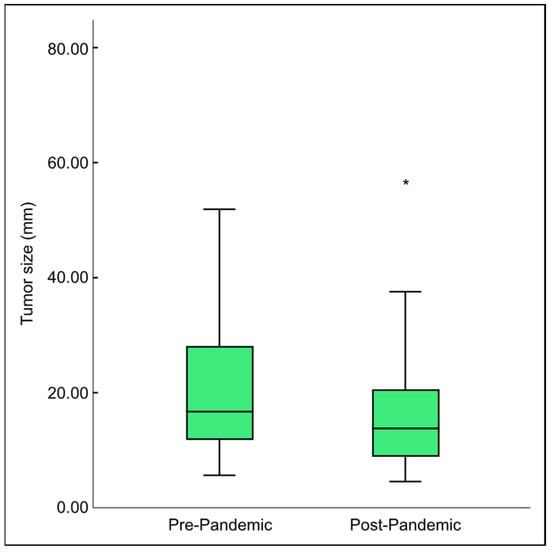 Comparison of the median tumor size found in final histopathology before and after the COVID-19 pandemic. * indicates significance using the t-test with p = 0.001.