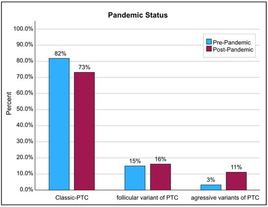 Parallel concepts about other viruses and human malignancies are relevant here. Although the human papillomavirus, hepatitis B and C viruses, and the Epstein–Barr virus (EBV) are all known to cause human malignancies, thyroid cancer is not commonly considered to be a classical type of cancer that is connected with viruses [42]. However, the question of whether or not COVID-19 can cause an increase in the incidence of thyroid cancer is speculative. Despite this, the current study showed not only an increase in thyroid cancer cases operated on in our center, but also a rise in the aggressive parameters found in final pathologies, such as bilateral multifocality, tall cell variants, and capsular and vascular invasion. These interesting findings occurred just one year after the COVID-19 outbreak. The pandemic and its related factors, such as psychological stress, infection, and transmission, are the only variables that could be responsible for this new finding.