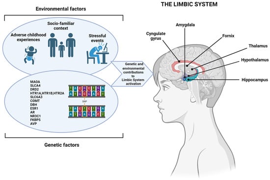 Mutations of several genes, certain mental health conditions, and/or stress, fear, or a sense of losing control may also generate aggression (Figure 1) [].