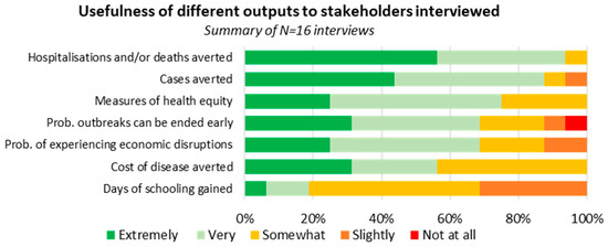 Participants considered metrics capturing epidemiological and health outcomes such as cases and deaths averted the most useful outputs for informing advocacy and the impacts of future investment, with more than 90% of respondents considering them to be “very useful” or “extremely useful” (Figure 1). Measures of economic impact and outbreak risk, such as the cost of illness averted or the probability that outbreaks can be ended early, were also considered to have high utility by most interviewees, but with varied responses depending on participants’ backgrounds.