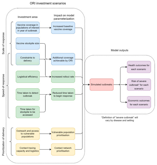 Investment in elements of an ORI program (e.g., vaccine stockpile size or the time taken to detect an outbreak) can be mapped to model parameters (Figure 2). These parameters (e.g., baseline vaccine coverage or vaccine rollout rate) can be varied to define different scenarios and explore the relative impact on outbreak size, and therefore health, economic, and risk outcomes. The relationship between investment in ORI components and model parameters would depend on the specific context being considered.