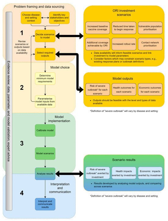 There are also limitations to the framework. While it was designed to be generalisable and model agnostic, the interpretation and communication of results will always be contextual. Consultation with country teams or experts with knowledge of specific ORI programs is necessary to support any assumptions, particularly when data are unavailable or there is ambiguity as to their interpretation. Depending on the disease characteristics or stakeholder needs, the requirements of an analysis may also expand beyond the methods or output metrics described here. In particular, the data availability search and assessment of outcome metrics was considered primarily in the context of LMICs. However, the findings of this study and the proposed framework should be broadly applicable to outbreaks in high-income countries as well, with potential adjustments required for the input data, output metrics, and interpretation of results for stakeholders. Although the framework incorporates the needs of stakeholders, the model choice or development and analysis stages require varying degrees of technical understanding (depending on the model), which limits its accessibility.
