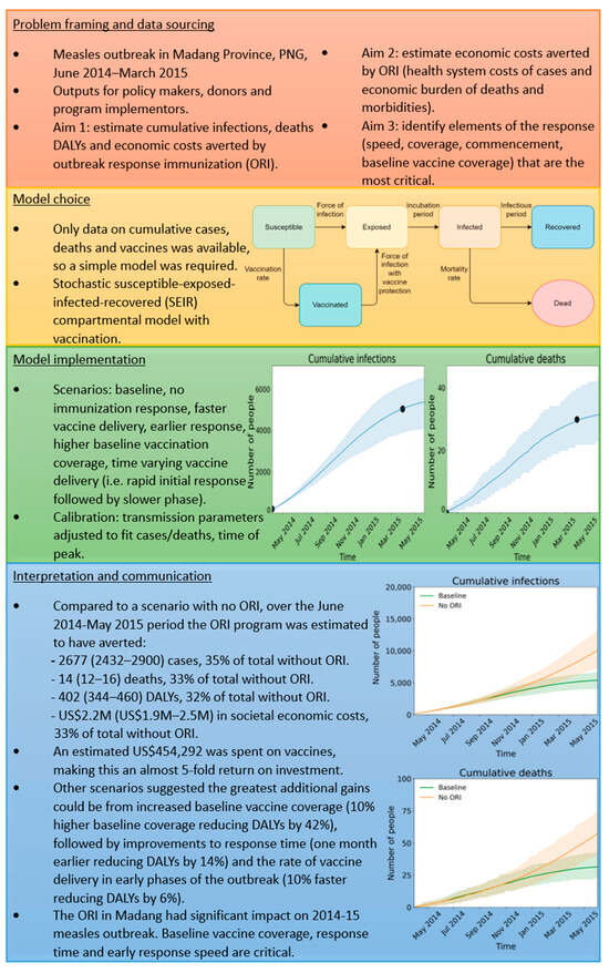 Summary of 2014–2015 Madang Province, PNG measles outbreak analysis. Each coloured section aligns with a phase of the framework and briefly describes details relevant to that phase.