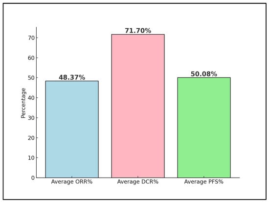 Naumann et al. [] observed an ORR of 26.3% and a DCR of 68.4%, with a significant 15.8% of patients achieving a complete response. With a median follow-up time of 19.2 months, the median overall survival (OS) was reported at 21.9 months, and the 12-month PFS rate was 26.3%, with a median PFS of 5.1 months. These results underscore nivolumab’s safety and efficacy, showing promising survival outcomes in patients with advanced cervical cancer.