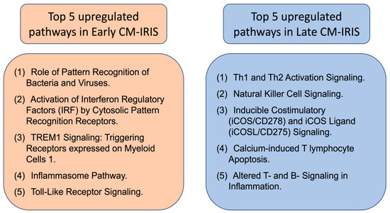 Top 5 canonical pathways that were overrepresented in upregulated transcript sets in early and late (non-fatal) CM-IRIS subgroups. The top five pathways are those with the largest proportion of transcripts upregulated within the pathway (based on the ingenuity pathway analysis assignment of individual transcripts [82]). Data were extracted for review from [82].