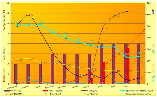 Severe and fatal HBV infectious process in a CVID patient despite IVIG therapy. Timeline shows HBV-induced hepatocellular carcinoma, serum sickness (with vasculitis and renal failure) development in spite of the “protective” anti-HBs level (yellow line). Very fast tumor growth corresponded with alfa fetoprotein (AFP) level. This indicates that the cancer process began around November (extrapolation based on available ultrasound data—dashed red line). The point corresponded with the start of a significant decrease in specific anti-HBs (to 185 mg/dL) within the period (September–November). The fall in the pound was exacerbated in spite of IVIG dose escalation. The individual parameters were distinguished by the colors and markers visible in the legend. The colors of the continuous line (measured values) correspond tothe colours in descriptions of the vertical axes. Extrapolated values (i.e., logarithmic growth of the tumor) are presented by a dashed line.