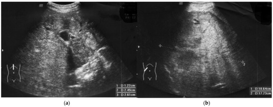 Weight loss and significant deterioration (Eastern Cooperative Oncology Group (ECOG) status 4) were observed. Due to the patient’s condition, which included the risk of severe complications and immunodeficiency, the patient was disqualified from oncological therapy (e.g., immunotherapy with atezolizumab) by the Tumor Board [15]. Finally, metastases and hepatic encephalopathy were observed with fatal outcome within one month after HCC confirmation, and fast tumor progression was observed in ultrasonography (Figure 2b).
