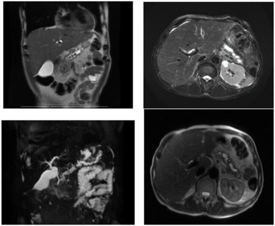- Magnetic resonance cholangiopancreatography (Cholangio-MR): Destructuralized, inhomogeneous pancreas with fine inflammatory changes at the cephalopancreatic level; retrograde dilation of the Wirsung canal up to 15 mm above the isthmic segment with inhomogeneous content, and several stones of 1 cm diameter with obstructive pattern. Without dilatation of intrahepatic bile ducts. No hypo/hyperabsorbing areas suggestive of malignancy (Figure 2).