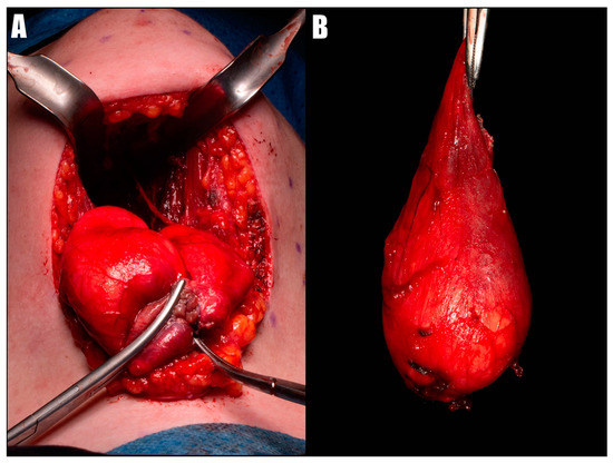 A cervical approach was chosen to reduce the risk of damaging the tongue muscles, lingual nerves, sublingual glands, and salivary ducts and to minimize the risk of oral bacterial infection. The patient expressed no concern regarding the potential for unaesthetic scar formation. The surgical procedure was carried out under general anesthesia with nasotracheal intubation (NTI), allowing for the administration of anesthetic gases without restricting access to the intraoral anatomy. One dose of antibiotic prophylaxis was administered before the operation. An incision of approximately 4 cm was made following the neck crease and the curvature of the mandible’s lower border. The mylohyoid and geniohyoid muscles were identified and divided by blunt dissection, carefully avoiding the submental vessels. Retractors were then used to gently pull the tissues laterally, facilitating the identification of the cyst capsule. The thick-walled cyst extended beyond the region of the hyoid bone without connecting to it, filling the space of the floor of the mouth, the body, and the base of the tongue and adjacent to the anterior pharyngeal wall. The cyst was delicately separated from surrounding tissues using blunt-ended scissors, and its capsule was then opened through a small incision. This allowed for partial cyst draining, reducing its size to lower the risk of accidental rupture and to facilitate the removal process. After suturing the capsule, the cyst was removed entirely, with the oral mucosa left intact (Figure 3). Bleeding throughout the surgical procedure was minimal. There was no need for any vessel ligation. A Redon drainage tube was left in the wound for one day to reduce the risk of hematoma formation. The patient was discharged from the hospital on the second day after the surgery.