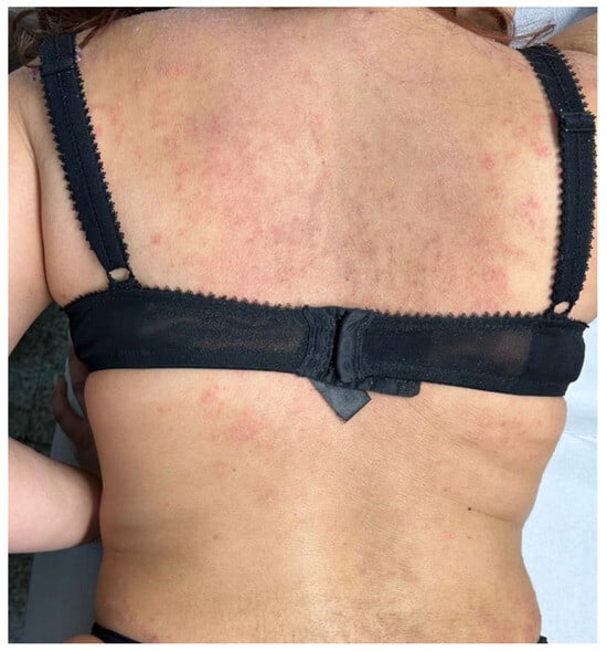 A 52-year-old female patient came to our attention on 14 October 2021 with severe itchy symptoms associated with various types of lesions. On the back and upper limbs (particularly at the level of the elbow flexures and the volar surface of the forearms), lesions typical of chronic eczema were observed, namely diffuse patches characterized by erythema, lichenification, and scaling (Figure 1). These patches were the most suggestive for a diagnosis of AD. Rather, plaques with brownish, itchy papules typical of LA were predominant in the lower limbs (Figure 2); there were also some similar, but less infiltrated and less widespread, small patches in the abdominal region. Lastly, diffuse skin xerosis and numerous scratching lesions were observed.