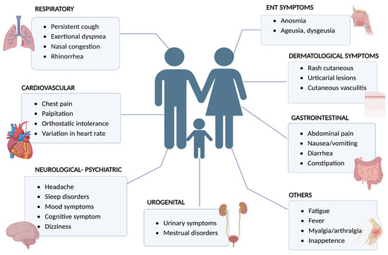 Long COVID symptoms in adults and children (created with Biorender https://www.biorender.com, accessed on 12 March 2024).