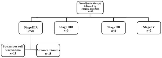 - Romero Roman, A.; Campo-Canaveral de la Cruz, J.; Macia, I.; Escobar Campuzano, I.; Figueroa Almanzar, S.; Delgado Roel, M.; Galvez Munoz, C.; Garcia Fontan, E.M.; Muguruza Trueba, I.; Romero Vielva, L.; et al. Outcomes of Surgical Resection after Neoadjuvant Chemoimmunotherapy in Locally Advanced Stage IIIA Non-Small-Cell Lung Cancer. Eur. J. Cardiothorac. Surg. 2021, 60, 81–88. [Google Scholar] [CrossRef] [PubMed]