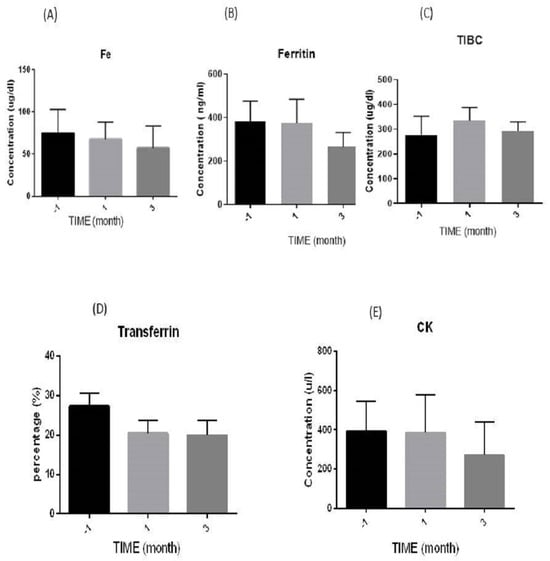 Schematic diagram of the biochemical serum levels during the study: (A) iron (Fe), (B) ferritin, (C) total iron binding capacity (TIBC), (D) transferrin (as percentage, %), and (E) creatine kinase (CK). The three times estimated were before (month −1) and after one month, as well as three months after transplantation. p-value > 0.05. µg/dL: microgram per deciliter; u/L: units of enzyme activity per liter; and ng/mL: nanograms per milliliter.