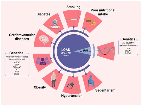LOAD is influenced by a wider range of environmental and lifestyle factors. Several cardiovascular risk factors have been associated with an increased risk, including hypertension. Chronic high blood pressure has been associated with an increased risk of LOAD. It may contribute to cerebrovascular changes that may exacerbate AD-related brain pathology [25]. Diabetes: Type 2 diabetes is considered a potential risk factor for LOAD. Insulin resistance and glucose dysregulation may adversely affect brain function and contribute to AD pathology [26]. Smoking is a significant risk factor for LOAD, and it is a factor that individuals can actively change. It is thought to promote oxidative stress and inflammation, processes that may exacerbate neurodegeneration [27]. Hypercholesterolemia: Elevated cholesterol levels in midlife have been associated with an increased risk of LOAD later in life. High cholesterol may contribute to the buildup of Aβ plaques in the brain [28]. Physical Activity and diet: Engaging in regular physical activity and maintaining a heart-healthy diet may help reduce the risk of LOAD. These lifestyle choices are associated with improved cardiovascular health, which, in turn, may benefit brain health [29].