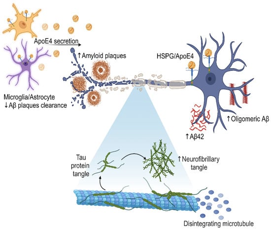 Secretion of ApoE4 by microglia and astrocytes in the brain, leading to an increase in the amount of Aβ, oligomeric Aβ, and amyloid plaques. The presence of ApoE4 also correlates with the formation of neurofibrillary tangles, which disintegrate microtubules and contribute to neurodegeneration. The effect of the interaction between ApoE4 and HSPG may further modulate amyloid pathology and disease progression. This visual representation illustrates the molecular mechanisms and cellular interactions involved in the AD pathological cascade, highlighting the central role of ApoE4 in this process. Created with BioRender.com.