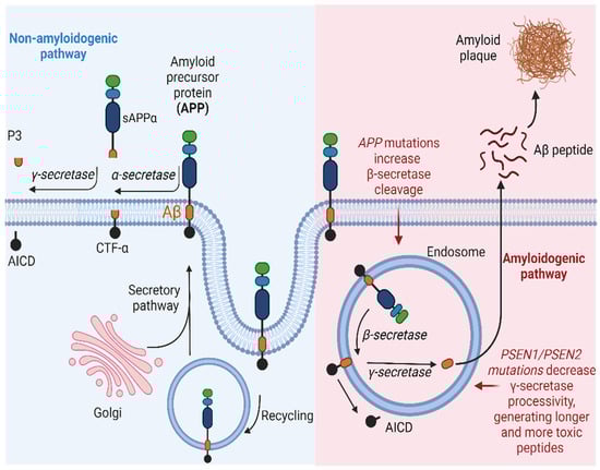 Schematic representation of the amyloidogenic and non-amyloidogenic pathways. (Left) APP undergoes proteolytic cleavage by α-secretase, generating sAPPα and CTFα. Subsequent processing by γ-secretase yields p3 and AICD. This non-amyloidogenic pathway occurs primarily at the plasma membrane, with APP recycling in endosomes facilitated by interaction with low-density lipoprotein receptors. (Right) In the amyloidogenic pathway, APP is cleaved by β-secretase, releasing sAPPβ and CTFβ. Further cleavage by γ-secretase results in the release of Aβ and AICD. This pathway predominantly occurs within endosomes. AICD translocates to the nucleus, functioning as a transcriptional factor, while extracellular Aβ monomers aggregate, forming oligomers or fibrils/plaques associated with AD. Created with BioRender.com.