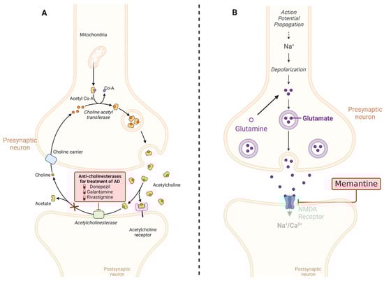 Mechanisms of action of the most common drugs used in AD. (A) CIs such as donepezil, rivastigmine, and galantamine work by blocking the activity of acetylcholinesterase, an enzyme that breaks down acetylcholine. By inhibiting acetylcholinesterase, these medications increase the levels of acetylcholine in the brain, which can help improve cognitive function in AD patients. (B) Memantine is an NMDA receptor antagonist that regulates glutamate activity in the brain. By blocking excessive activation of NMDA receptors, memantine helps to protect neurons from excitotoxicity, which is associated with neurodegenerative processes in AD. This mechanism helps to stabilize neuronal activity and may slow the progression of cognitive decline in AD patients. This diagram illustrates the distinct mechanisms of action of cholinesterase inhibitors and memantine in the treatment of AD. Created with BioRender.com.