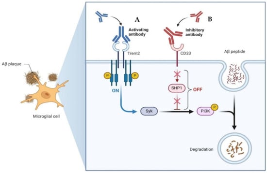 Example of the mechanisms of action of an emerging treatment with antibodies for AD. (A) Activating antibody for TREM2. This antibody targets TREM2 and interacts with Syk. By activating TREM2 signaling pathways via Syk, this antibody enhances microglial function and promotes the clearance of Aβ plaques from the brain. (B) Inhibitory antibody for CD33. By interacting with SHP1, the antibody inhibits the inhibitory signaling pathways downstream of CD33. This results in enhanced microglial phagocytic activity and degradation of Aβ. Both antibodies offer promising therapeutic approaches for AD by targeting key immune regulatory proteins involved in the clearance of Aβ plaques. Created with BioRender.com.