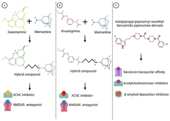 Structures of hybrid compounds and indolylpropyl benzamidopiperazine derivate. (A) Galantamine and memantine. (B) Rivastigmine and memantine. (C) indolylpropyl benzamidopiperazine derivate. The hybrid compounds are shown by the color combination of the drugs. Functions are indicated below. These compounds represent a promising class of multitarget drugs, potentially leading to a reduction in its progression. Created with BioRender.com.