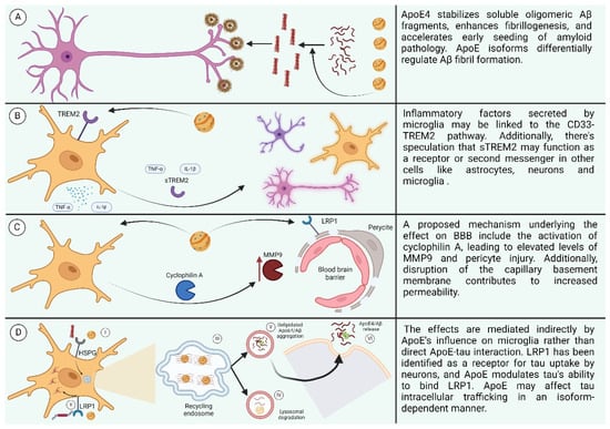 The receptors on the cell surface for ApoE are heparan sulfate proteoglycans (HSPGs), which serve as integral components in the orchestration of numerous intricate cellular mechanisms, including but not limited to cell adhesion, signaling cascades, and the effective clearance of Aβ peptides. Importantly, ApoE4 exhibits a binding affinity to HSPGs approximately three times higher than ApoE2 or ApoE3, indicating that the APOEε4 allele, associated with AD risk, binds more strongly to HSPGs [50]. This interaction may affect the binding, uptake, clearance, and aggregation of Aβ peptides by neurons and microglia, leading to the accumulation of Aβ plaques in the brain, a hallmark of AD pathology [51].