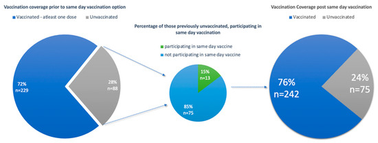 Graphs illustrating vaccine coverage of the study population pre- and post-same-day vaccination.
