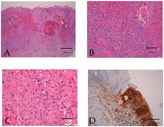 Biopsy specimen. Hematoxylin and eosin 4×, epithelial ulceration, and sub-epithelial ill-defined tumor composed of irregular vascular channels and spindle cells. Marked surrounding inflammatory infiltrate (A). Hematoxylin and eosin 20×, solid area composed of spindle cells with variable nuclear atypia and hemorrhagic extravasations (B). Hematoxylin and eosin 40×, solid area composed of spindle cells with variable nuclear atypia and mitotic activity (C). CD31 4×, vascular channels with membranous expression of CD31 immunostaining (D).