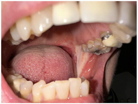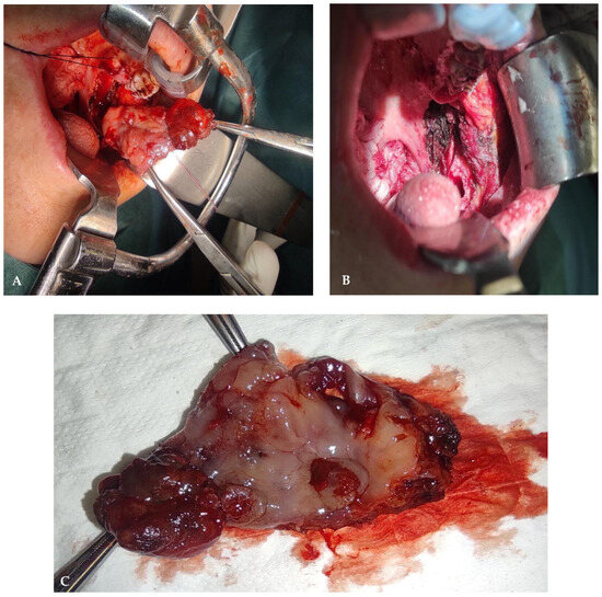 Local disease radical surgery with complete resection (R0) was planned as the primary treatment of choice. On 31 May 2022, tumor excision was performed through a transoral approach. A mucosa and submucosa incision were made up to the muscular level of the left gingival region, extending upwards to the tuber maxillae, downwards to the retromolar trigone, posteriorly to the anterior tonsillar pillar, and superiorly to the Stenon duct. The entire area, including the lesions, was removed en bloc, preserving the lingual nerve (Figure 4).