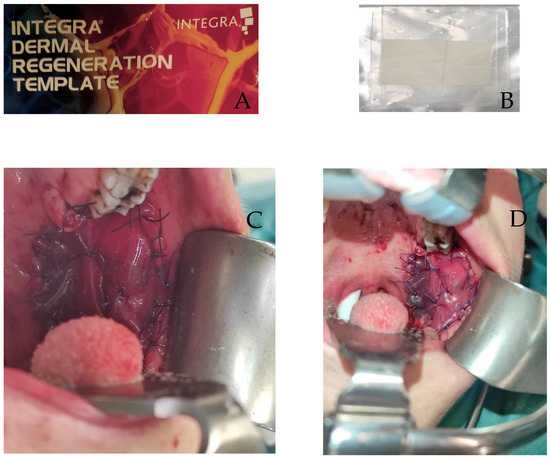 Integra® Dermal Regeneration Template, Integra LifeSciences (A), silicone layer of a porous matrix of cross-linked bovine tendon collagen, glycosaminoglycan, and a semipermeable polysiloxane (B). The created defects are covered with an Integra bilayer secured with 3-0 Vicryl sutures to the oral mucosa (C,D).