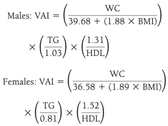 - Visceral adiposity index (VAI) [17], calculated as reported in Figure 1; it describes how all determinants of the metabolic syndrome increase their absolute value in the presence of a higher VAI (>2.5) [18].