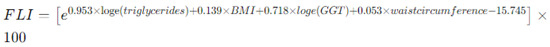 - Fatty liver index (FLI) [25], an algorithm used to estimate the presence of fatty liver disease and hepatic steatosis: it is calculated using the formula reported in Figure 2, that incorporates several parameters such as BMI, waist circumference, triglycerides, and gamma-glutamyl transferase (GGT) levels. In pediatric patients, an FLI exceeding 30 is considered pathological, as it is associated with hepatic steatosis and increased cardiovascular risk.