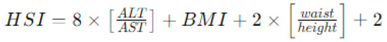 - Hepatic steatosis index (HSI) [26], calculated using a formula based on BMI, waist circumference, and serum levels of AST (aspartate aminotransferase) and ALT (alanine aminotransferase), as reported in Figure 3. Similar to the FLI, an HSI > 30 is considered associated with hepatic steatosis and increased cardiovascular risk.