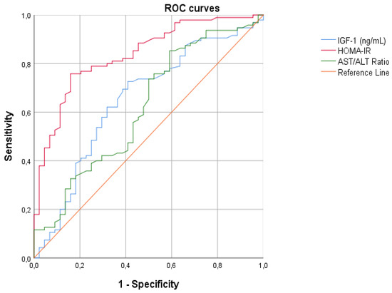ROC curves assessing the cardiovascular risk and laboratory parameters of patients. Legend: IGF-1 insulin growth factor-1; HOMA-IR homeostasis model assessment of insulin resistance index; AST/ALT ratio alanine aminotransferase/aspartate aminotransferase ratio.