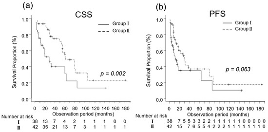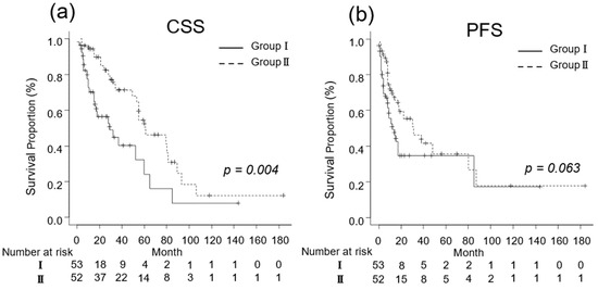 For patients with a good performance status (ECOG-PS ≤ 1), the oncological outcomes are presented in Figure 2. The median CSS was 14 (IQR, 6–29) and 32 (IQR, 17–60) months in Groups I (n = 53) and II (n = 52), respectively (p = 0.004; Figure 2a). The median PFS for Groups I and II was 7 (IQR, 3–14) and 13 (IQR, 8–26) months, respectively (p = 0.063; Figure 2b).
