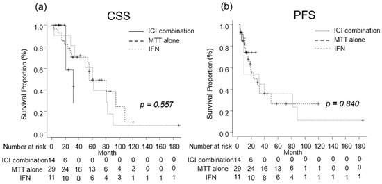 We investigated the oncological outcomes of patients with mRCC who received combination therapy including ICI, MTT alone, or IFN as systemic therapy. The median CSS was 32 (IQR, 21-NA) months in patients with mRCC receiving combination therapies including ICI, 79 (IQR, 53–106) months in those receiving MTT alone, and 61 (IQR, 28–81) months in those receiving IFN (Figure 5a). The median PFS was not reached (IQR, 8–NA months) in patients with mRCC who received combination therapies including ICI, 28 (IQR, 12-NA) months for those who received MTT alone, and 30 (IQR, 7–87) months in those who received IFN (Figure 5b). No significant differences in CSS or PFS were observed between the treatment regimens (Figure 6).