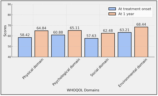 The data showed significant improvements in certain quality-of-life domains over the one-year period. The physical domain of WHOQOL scores, which assesses the physical health and levels of physical pain and discomfort, showed an increase from an average of 58.42 (SD ± 14.79) at treatment onset to 64.84 (SD ± 16.05) after one year, with a statistically significant p-value of 0.005. The environmental domain also exhibited a significant improvement, with scores rising from 63.21 (SD ± 15.83) at the beginning of the treatment to 68.44 (SD ± 17.34) after one year (p = 0.033).