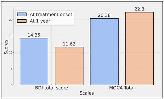 The BDI total score, which assesses depressive symptoms, significantly decreased from 14.35 at the onset of treatment to 11.62 after one year, as indicated by a p-value of 0.003. Significant improvements were also observed in several MOCA sub-scores over the course of the study. Specifically, execution scores increased from 2.76 to 2.98 (p = 0.003), naming scores from 2.47 to 2.79 (p < 0.001), language scores from 1.69 to 1.97 (p = 0.011), abstraction scores from 1.23 to 1.41 (p = 0.007), recall scores from 2.34 to 2.76 (p < 0.001), and orientation scores from 5.68 to 5.91 (p = 0.008).