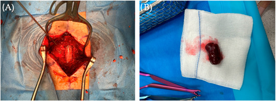(A) Following laminectomy for spinal canal decompression, a bulging dural sack appeared with tumor located intradurally. (B) Picture presents the brownish-in-color tumor, resected en bloc.