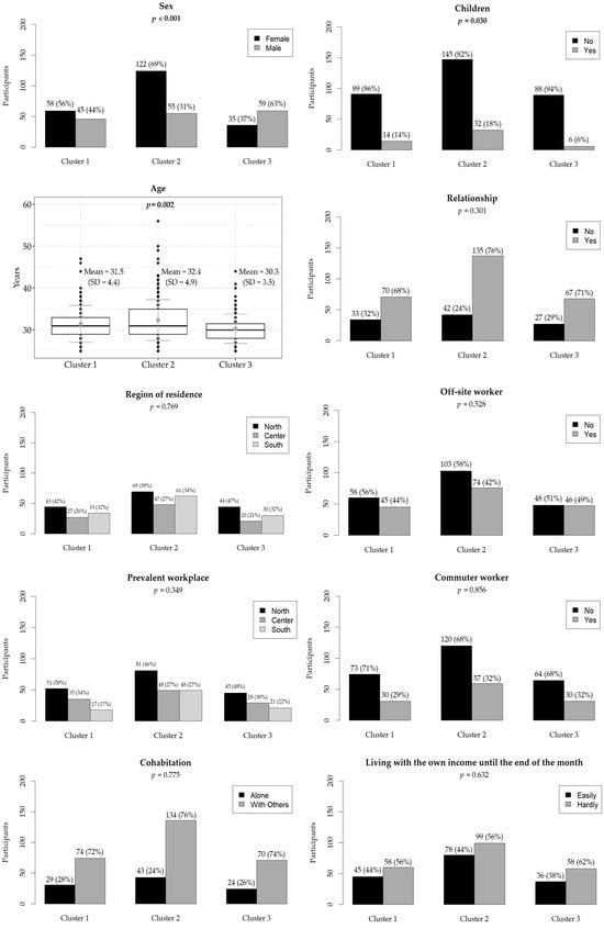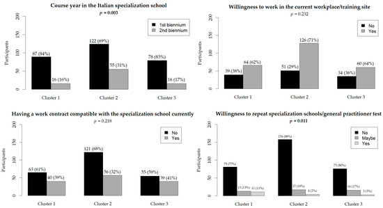 The region of residence did not show significant differences (p = 0.769), with a relatively even distribution across the center, north, and south in all clusters. Similarly, prevalent workplace locations did not differ significantly (p = 0.349). Living conditions, including cohabitation status (p = 0.775) and the number of children (p = 0.053), were not significantly different among clusters. Most participants in all clusters cohabited with others, and a majority had no children. There were no significant differences in the proportion of off-site workers (p = 0.528) and commuter workers (p = 0.856) among the clusters. Additionally, the ease of living on one’s income until the end of the month was similar across clusters (p = 0.632), with approximately half of the participants in each cluster reporting difficulty. Having additional compatible contracts with the specialization school did not differ significantly among clusters (p = 0.218). Willingness to work at their current workplace or training site (p = 0.232) also showed no significant differences, although there was a trend towards higher willingness in CL2 (71%). Results are shown in Figure 1, Figure 2 and Figure 3.