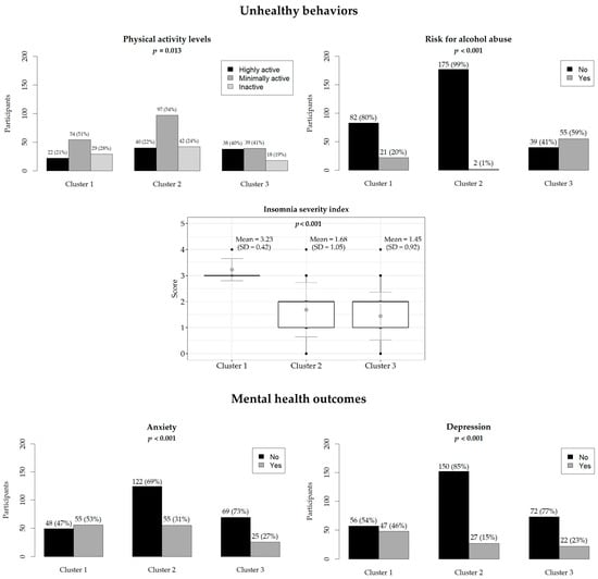 Sociodemographic and behavioral variables were described using descriptive statistics, presenting means and standard deviations (SD) for continuous variables, whereas frequencies and percentages were used for categorical variables. Responses to IPAQ, AUDIT-c, and ISI2 were used to identify clusters with distinct UBs profiles through a hierarchical cluster analysis. No variable showed missing values. To identify the best number of clusters, Ward’s clustering criterion based on Manhattan distance [28] was used to calculate the dissimilarity matrix. A Hubert index was graphed to choose the optimal number of clusters. Supplementary Figure S1 provides a graph of that index, the corresponding knee, and related statistics. Additional indices were consulted using the R package NbClust, identifying three as the optimal number of clusters based on thirty algorithms. The clusters were shown in a dendrogram. To ensure the stability of the clustering results, we conducted multiple iterations of the clustering process and observed consistent formation of three clusters. We also performed silhouette analysis, which measures how similar an object is to its own cluster compared to other clusters. The average silhouette width supported the choice of three clusters, indicating a clear and stable separation between clusters. We examined the practical relevance and interpretability of the identified clusters by analyzing the characteristics of the data within each cluster. The composition of the clusters was described using a Kruskal–Wallis test for continuous variables or a Chi-square test for categorical variables; each were performed to evaluate whether significant differences in the distribution of UBs and all the collected covariates existed between clusters. Statistical significance was set at p < 0.05. All the analyses were performed using R 4.2.3.
