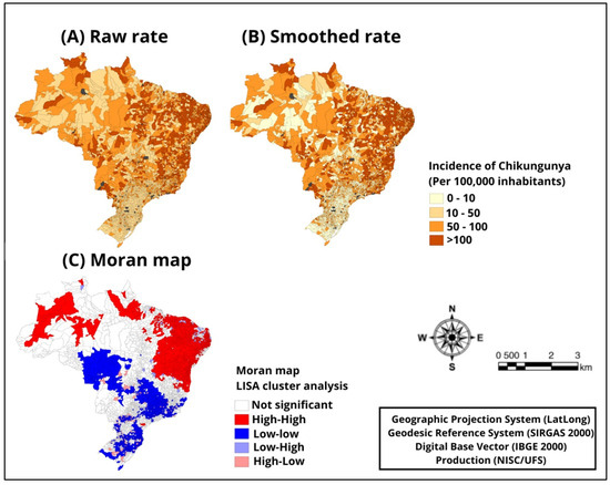 Initially, the incidence rate calculation was performed by considering the total annual cases of chikungunya per municipality divided by the population of the municipality and multiplied by a constant of 100,000 inhabitants. To display the spatial distribution of chikungunya incidence, maps were constructed to visualize the incidence of chikungunya in Brazilian municipalities, along with maps showing the smoothed distribution of incidence rates using the local empirical Bayesian estimator.
