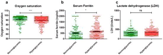 Inflammatory parameters in normoglycemic and hyperglycemic subjects infected with SARS-CoV-2. The dot plots illustrate the mean (Mean ± SEM) oxygen saturation levels (a), serum ferritin (b), and LDH levels (c) in admitted subjects, comparing normoglycemic and hyperglycemic groups. Statistical comparison between the two groups was conducted using an unpaired t-test (two-tailed), and a p-value < 0.05 was considered statistically significant. * p < 0.05 and *** p < 0.001, NS: Non-Significant.