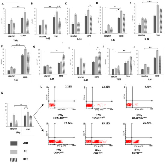 Continuous use of either CCs or HTPs modulates cytokine production in immune cells of COPD patients. Total numbers of TNF-α- (A), IL-1β- (B), IL-13- (C), IL-17- (D), IL-22- (E), IL-23- (F), IL-10- (G), IL-35- (H), TGF-β- (I), IL-6- (J), and IFN-γ-producing immune cells (K) in the blood of healthy volunteers and COPDCC, COPDHTP, and COPDAIR patients, including representative dot plots (L), demonstrating altered capacity for cytokine production in leukocytes of COPD patients who used CCs or HTPs. Values are presented as mean ± SEM; * p < 0.05, ** p < 0.01, *** p < 0.001.